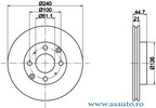 Partea de montare punte fata Echipament vehicul pentru vehicule cu directie servoasistata Diametru [mm] 240 mm Înaltime [mm] 44,7 mm Grosime minima [mm] 19 mm Tip disc frâna ventilat interior Numar gauri 4 Diametru de centrare [mm] 61 mm