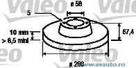 Partea de montare puntea spate Tip disc frâna plin Diametru [mm] 265,5 mm Grosime minima [mm] 8,5 mm Înaltime [mm] 67,4 mm Diametru de centrare [mm] 58 mm Numar gauri 5