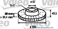 Partea de montare punte fata Tip disc frâna ventilat Diametru [mm] 300 mm Înaltime [mm] 45,5 mm Diametru de centrare [mm] 67 mm Numar gauri 5 Grosime minima [mm] 26 mm
