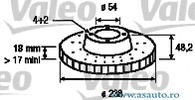 Partea de montare punte fata Tip disc frâna ventilat interior Diametru exterior 238 mm Grosime [mm] 18 mm Grosime minima [mm] 17 mm Înaltime [mm] 48 mm Diametru asezare gauri -? 1 [mm] 100 mm Alezaj butuc -? [mm] 54,05 mm