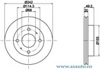 Partea de montare punte fata Dinamica frânare/conducere pentru vehicule fara ABS Diametru [mm] 242 mm Înaltime [mm] 49,2 mm Tip disc frâna ventilat Grosime minima [mm] 18 mm Diametru interior [mm] 138 mm Numar gauri 4 Diametru de centrare [mm] 68 mm Diametru asezare gauri -? [mm] 114,3 mm