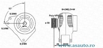 Curent electric vehicul pentru vehicule cu instalatie de 12V Tensiune [V] 12 V Curent de incarcare generator [A] 120 A Numar nervuri 6 Fulie curea -? [mm] 68 mm Conector/clema cu conector pentru turometru Lungime 1 [mm] 39,5 mm Alezaj-? 1 [mm] 8,5 mm Lungime 3 [mm] 61 mm Grosime 1 [mm] 14 mm